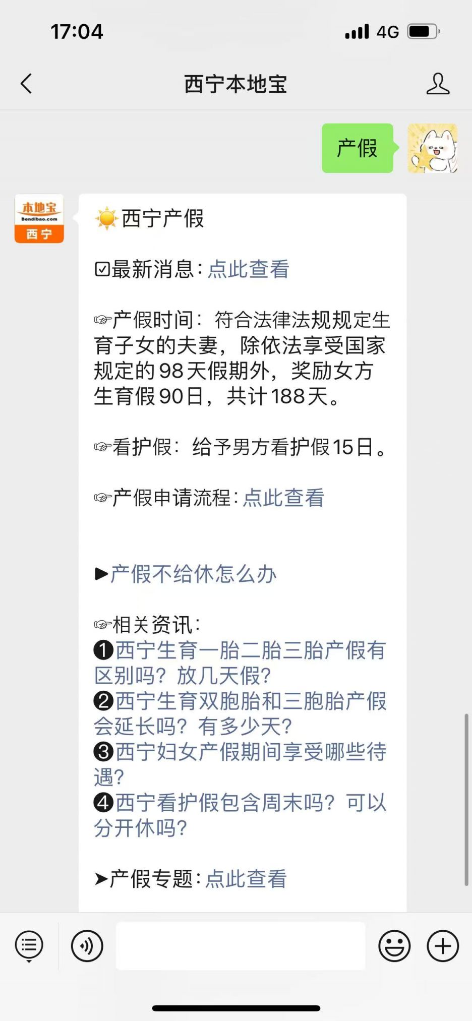 温馨提示:识别上方二维码关注【西宁本地宝】,关注后在对话框回复【产假】获取西宁产假/看护假等最新消息、放假时长、相关问题解答及专题查询入口等信息。
